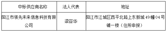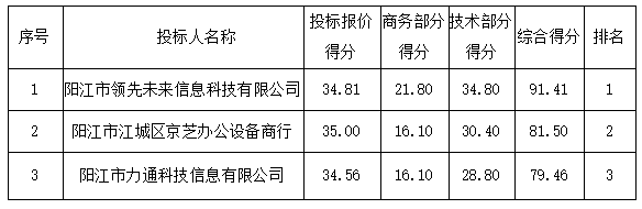 投標(biāo)結(jié)果:最終評(píng)標(biāo)委員會(huì)一致推薦 陽(yáng)江市領(lǐng)先未來(lái)信息科技有限公司 為中標(biāo)單位,中標(biāo)金額為人民幣 502642.00 元,(大寫金額: 伍拾萬(wàn)零貳仟陸佰肆拾貳元整 )。
