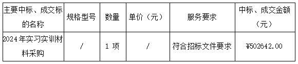 廣東業(yè)信采購(gòu)招標(biāo)有限公司受 陽(yáng)江市第一職業(yè)技術(shù)學(xué)校 的委托,于2024年8月6日就 陽(yáng)江市第一職業(yè)技術(shù)學(xué)校2024年實(shí)習(xí)實(shí)訓(xùn)材料采購(gòu)項(xiàng)目 (項(xiàng)目編號(hào):YXCG-20240608)采用公開(kāi)招標(biāo)方式進(jìn)行采購(gòu)?,F(xiàn)就本次采購(gòu)的中標(biāo)結(jié)果公告如下: