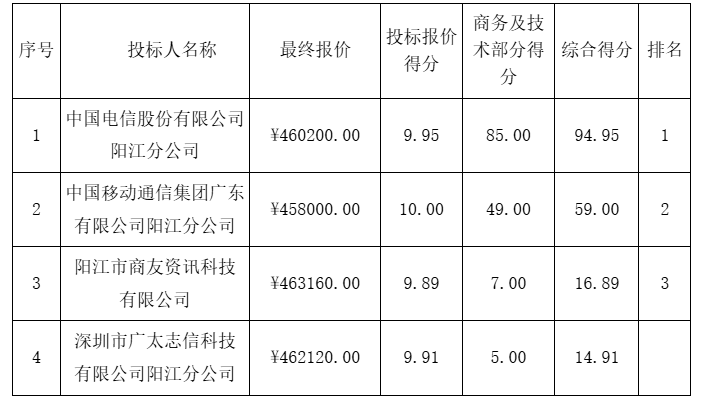 磋商結(jié)果:最終磋商小組一致推薦 中國(guó)電信股份有限公司陽(yáng)江分公司 為成交單位,成交金額為人民幣 460200.00元,(大寫(xiě)金額: 肆拾陸萬(wàn)零貳佰元整 )。
