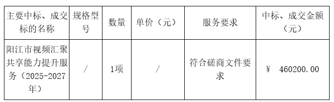 廣東業(yè)信采購(gòu)招標(biāo)有限公司受 陽(yáng)江市公安局 的委托,于2025年7月25日就 陽(yáng)江市視頻匯聚共享能力提升服務(wù)(2025-2027年)項(xiàng)目(項(xiàng)目編號(hào):YXCG-20250713)采用競(jìng)爭(zhēng)性磋商方式進(jìn)行采購(gòu)?,F(xiàn)就本次采購(gòu)的成交結(jié)果公告如下:
