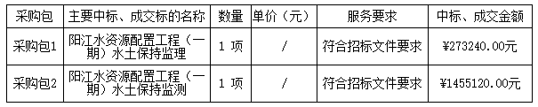 廣東業(yè)信采購(gòu)招標(biāo)有限公司受 陽(yáng)江市碧源水資源開(kāi)發(fā)有限公司 的委托,于2025年9月10日就 陽(yáng)江水資源配置工程(一期)水土保持監(jiān)理和監(jiān)測(cè) (項(xiàng)目編號(hào):YXCG-20250814)采用公開(kāi)招標(biāo)方式進(jìn)行采購(gòu)?,F(xiàn)就本次采購(gòu)的中標(biāo)結(jié)果公告如下: