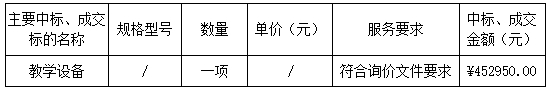 廣東業(yè)信招標(biāo)有限公司受陽(yáng)江市共青湖學(xué)校的委托,于2024年8月29日就陽(yáng)江市共青湖學(xué)校教學(xué)設(shè)備采購(gòu)項(xiàng)目(項(xiàng)目編號(hào):YXZB-20240822)進(jìn)行詢價(jià)采購(gòu),現(xiàn)將本次采購(gòu)結(jié)果公告如下: