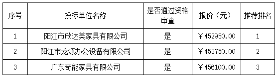 報(bào)價(jià)結(jié)果:最終詢價(jià)小組一致推薦 陽(yáng)江市欣達(dá)美家具有限公司 為成交單位,成交金額為人民幣 452950.00 元(大寫(xiě)金額: 肆拾伍萬(wàn)貳仟玖佰伍拾元整 )。