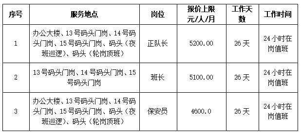 1.項(xiàng)目名稱:陽(yáng)江市陽(yáng)江港廣泰隆碼頭有限公司保安服務(wù)采購(gòu)項(xiàng)目(預(yù)算詢價(jià))