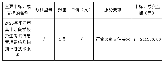 廣東業(yè)信采購招標(biāo)有限公司受 陽江市教育局 的委托,于2025年3月3日就 2025年陽江市高中階段學(xué)校招生考試信息管理系統(tǒng)及掃描評(píng)卷技術(shù)服務(wù)項(xiàng)目(項(xiàng)目編號(hào):YXCG-20250217)采用競爭性磋商方式進(jìn)行采購?,F(xiàn)就本次采購的成交結(jié)果公告如下: