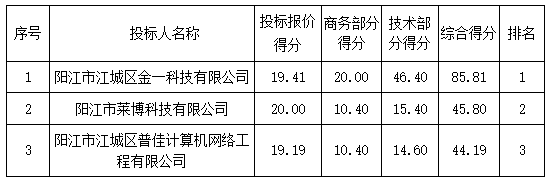 投標(biāo)結(jié)果:最終評標(biāo)委員會一致推薦 陽江市江城區(qū)金一科技有限公司 為中標(biāo)單位,中標(biāo)金額為人民幣 195000.00 元,(大寫金額: 壹拾玖萬伍仟元整 )。