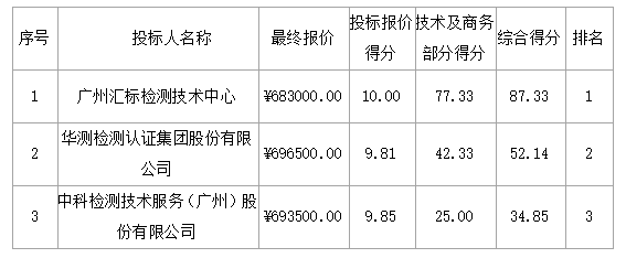 磋商結(jié)果:最終磋商小組一致推薦 廣州匯標檢測技術(shù)中心 為成交單位,成交金額為人民幣 683000.00元,(大寫金額: 陸拾捌萬叁仟元整 )。