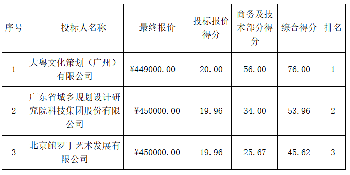 磋商結(jié)果:最終磋商小組一致推薦 大粵文化策劃(廣州)有限公司 為成交單位,成交金額為人民幣 449000.00元,(大寫(xiě)金額:肆拾肆萬(wàn)玖仟元整 )。