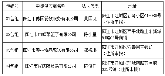 01包組:最終評(píng)標(biāo)委員會(huì)一致推薦 陽江市穗園餐飲服務(wù)有限公司 為中標(biāo)單位,中標(biāo)折扣率為 98% 。