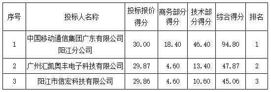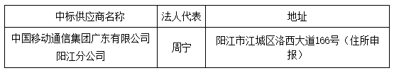 投標(biāo)結(jié)果:最終評(píng)標(biāo)委員會(huì)一致推薦 中國移動(dòng)通信集團(tuán)廣東有限公司陽江分公司 為中標(biāo)單位,中標(biāo)金額為人民幣 938571.00 元,(大寫金額: 玖拾叁萬捌仟伍佰柒拾壹元整 )。