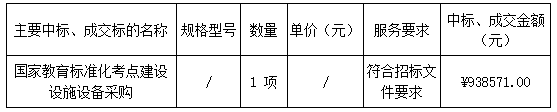 廣東業(yè)信采購招標(biāo)有限公司受 陽春市第三中學(xué) 的委托,于2024年12月24日就 陽春市第三中學(xué)國家教育標(biāo)準(zhǔn)化考點(diǎn)建設(shè)設(shè)施設(shè)備采購項(xiàng)目(項(xiàng)目編號(hào):YXCG-20241121)采用公開招標(biāo)方式進(jìn)行采購。現(xiàn)就本次采購的中標(biāo)結(jié)果公告如下: