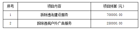 1. 項(xiàng)目名稱:陽江市江城區(qū)綜合行政執(zhí)法局2025年拆除違法建設(shè)和違規(guī)戶外廣告服務(wù)資格采購項(xiàng)目
