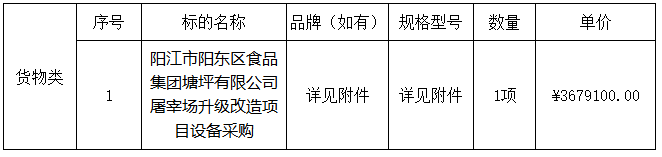 二、采購項目名稱:陽江市陽東區(qū)食品集團(tuán)塘坪有限公司屠宰場升級改造項目設(shè)備采購
