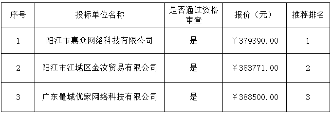 報(bào)價(jià)結(jié)果:最終詢價(jià)小組一致推薦陽江市惠眾網(wǎng)絡(luò)科技有限公司為成交單位,成交金額為人民幣379390.00元(大寫金額:叁拾柒萬玖仟叁佰玖拾元整)。