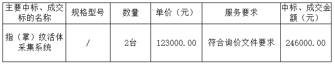 廣東業(yè)信招標(biāo)有限公司受陽江市公安局陽東分局的委托,于2023年8月8日就陽江市公安局陽東分局指(掌)紋活體采集系統(tǒng)采購項目(項目編號:YXZB-20230728)進行詢價采購,現(xiàn)將本次采購結(jié)果公告如下: