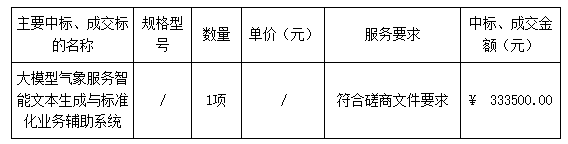 廣東業(yè)信采購(gòu)招標(biāo)有限公司受 陽(yáng)江市氣象臺(tái) 的委托,于2025年8月11日就 大模型氣象服務(wù)智能文本生成與標(biāo)準(zhǔn)化業(yè)務(wù)輔助系統(tǒng)項(xiàng)目(項(xiàng)目編號(hào):YXCG-20250717)采用競(jìng)爭(zhēng)性磋商方式進(jìn)行采購(gòu)?,F(xiàn)就本次采購(gòu)的成交結(jié)果公告如下: