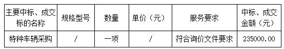 廣東業(yè)信采購招標有限公司受陽江市陽東區(qū)交通運輸局的委托,于2024年9月23日就特種車輛采購項目(項目編號:YXCG-20240909)進行詢價采購,現(xiàn)將本次采購結(jié)果公告如下: