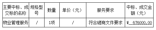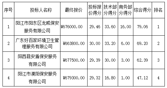 磋商結(jié)果:最終磋商小組一致推薦 陽江市陽東區(qū)龍威保安服務有限公司 為成交單位,成交金額為人民幣 676000.00元,(大寫金額: 陸拾柒萬陸仟元整 )。