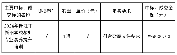 廣東業(yè)信采購招標(biāo)有限公司受 陽江市新陽學(xué)校 的委托,于2025年3月4日就 2024年陽江市新陽學(xué)校教師專業(yè)素養(yǎng)提升培訓(xùn)項(xiàng)目(項(xiàng)目編號(hào):YXCG-20250208)采用競爭性磋商方式進(jìn)行采購?,F(xiàn)就本次采購的成交結(jié)果公告如下: