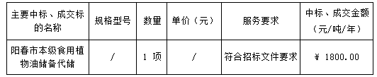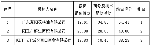 投標(biāo)結(jié)果:最終評(píng)標(biāo)委員會(huì)一致推薦 廣東漠陽(yáng)花糧油有限公司 為預(yù)中標(biāo)單位,中標(biāo)金額為人民幣 1800.00 元/噸/年,(大寫(xiě)金額: 壹仟捌佰元整 ) ,中標(biāo)總金額為人民幣 672000.00 元,(大寫(xiě)金額: 陸拾柒萬(wàn)貳仟元整 )。