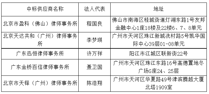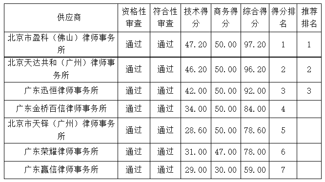 注:北京市隆安(廣州)律師事務(wù)所的資格審查文件未按招標(biāo)文件格式裝訂成冊(cè),作無效投標(biāo)處理;廣東言必行律師事務(wù)所的投標(biāo)文件未按招標(biāo)文件要求加蓋公章,作無效投標(biāo)處理;廣東啟源律師事務(wù)所的投標(biāo)文件未按招標(biāo)文件格式裝訂成冊(cè),作無效投標(biāo)處理。