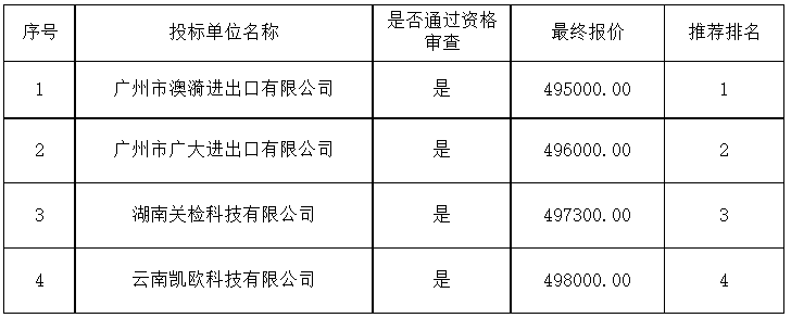 談判結(jié)果:最終談判小組一致推薦廣州市澳漪進(jìn)出口有限公司為成交單位,成交金額為人民幣495000.00元(大寫金額:肆拾玖萬伍仟元整)。
