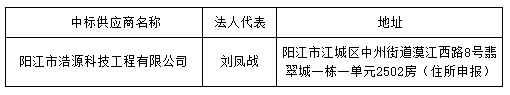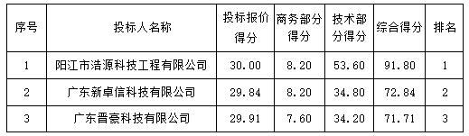 投標結果:最終評標委員會一致推薦 陽江市浩源科技工程有限公司 為中標單位,中標金額為人民幣 393952.00 元,(大寫金額: 叁拾玖萬叁仟玖佰伍拾貳元整 )。