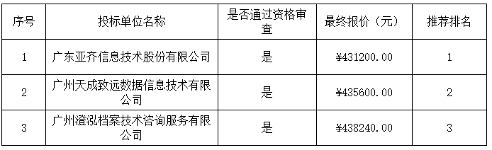 談判結果:最終談判小組一致推薦廣東亞齊信息技術股份有限公司為成交單位,成交金額為人民幣431200.00元(大寫金額:肆拾叁萬壹仟貳佰元整)。