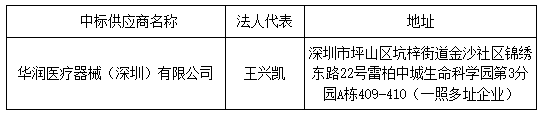 投標(biāo)結(jié)果:最終評標(biāo)委員會一致推薦 華潤醫(yī)療器械(深圳)有限公司 為中標(biāo)單位,中標(biāo)金額為人民幣 338300.00 元,(大寫金額: 叁拾叁萬捌仟叁佰元整 )。
