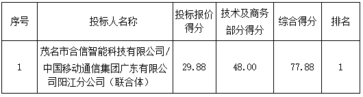 比選結(jié)果:最終比選小組一致推薦 茂名市合信智能科技有限公司/中國移動(dòng)通信集團(tuán)廣東有限公司陽江分公司(聯(lián)合體) 為成交單位,成交金額為人民幣 18622050.00元,(大寫金額: 壹仟捌佰陸拾貳萬貳仟零伍拾元整 )。