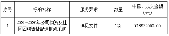 廣東業(yè)信招標(biāo)有限公司受 陽江市聚視文化傳媒有限公司 的委托,于2025年6月27日就 2025-2026年公司物資及社區(qū)團(tuán)購智慧配送框架采購項(xiàng)目 (項(xiàng)目編號(hào):YXZB-20250614)采用公開比選方式進(jìn)行采購?,F(xiàn)就本次采購的成交結(jié)果公告如下: