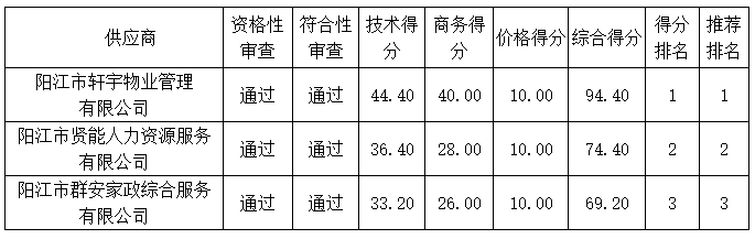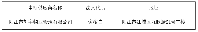 投標結果:最終評標委員會一致推薦陽江市軒宇物業(yè)管理有限公司為中標單位,中標金額為人民幣2137312.00元,(大寫金額:貳佰壹拾叁萬柒仟叁佰壹拾貳元整)。