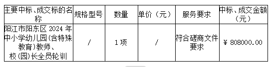 廣東業(yè)信采購招標(biāo)有限公司受 陽江市陽東區(qū)教師發(fā)展中心 的委托,于2024年9月29日就 陽江市陽東區(qū)2024年中小學(xué)幼兒園(含特殊教育)教師、校(園)長全員輪訓(xùn)項(xiàng)目(項(xiàng)目編號:YXCG-20240914)采用競爭性磋商方式進(jìn)行采購?,F(xiàn)就本次采購的成交結(jié)果公告如下: