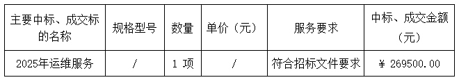 廣東業(yè)信采購招標(biāo)有限公司受 陽江市中西醫(yī)結(jié)合醫(yī)院 的委托,于2025年7月1日就 陽江市中西醫(yī)結(jié)合醫(yī)院2025年運維服務(wù)采購項目 (項目編號:YXCG-20250131)采用公開招標(biāo)方式進(jìn)行采購?,F(xiàn)就本次采購的中標(biāo)結(jié)果公告如下:
