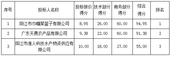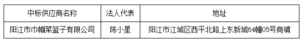 投標結果:最終評標委員會一致推薦 陽江市巾幗菜籃子有限公司 為中標單位,中標折扣率為 99.50% 。