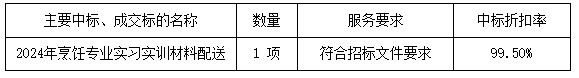 廣東業(yè)信采購招標有限公司受 陽江技師學院 的委托,于2024年8月16日就 陽江技師學院2024年烹飪專業(yè)實習實訓材料配送采購項目 (項目編號:YXCG-20240601)采用公開招標方式進行采購?,F(xiàn)就本次采購的中標結果公告如下: